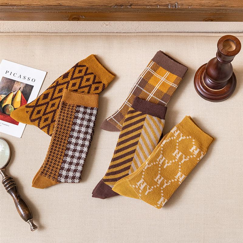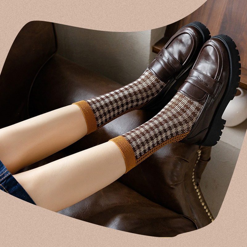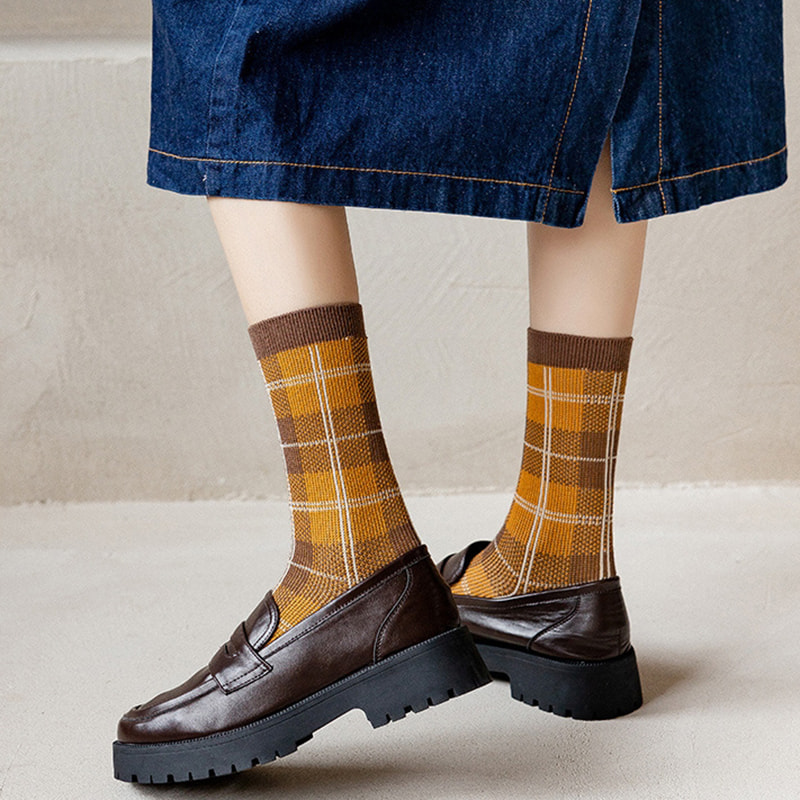/ 제품 / 여자 양말 / 여성 중간 튜브 양말 / 체크 무늬 표범 프린트 듀얼 트랙 이탈리아 레트로 이중 바늘 파일 양말